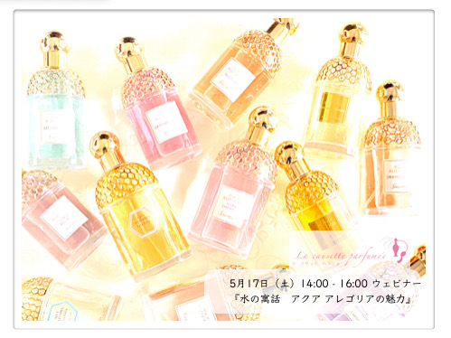 5月のラ コゼット パフュメ 香りのおしゃべり会は、zoom を使用したウェビナーを行います。テーマは『水の寓話 アクアアレゴリアの魅力』。今回は、2001年から2021年までに発売されたゲランのアクアアレゴリアシリーズの中から、7種類の香りを取り上げて解説します。植物の生命感を芸術に高めた香水として人気のアクアアレゴリアシリーズ。家に居ながらにして豊かな自然の香りに包まれる体験をしませんか?